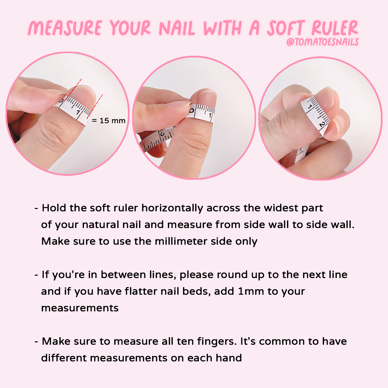 ā CUSTOM SIZE:Ā Please leave a note of your own measurements if youĀ don't have my sizing kitĀ in millimeters; for example: Left & Right = thumb 15/index 11/mid 12/ring 11/pinky 8 mm. OR nail size numbers according to the standard chart (e.g., 1/5/4/5/8)