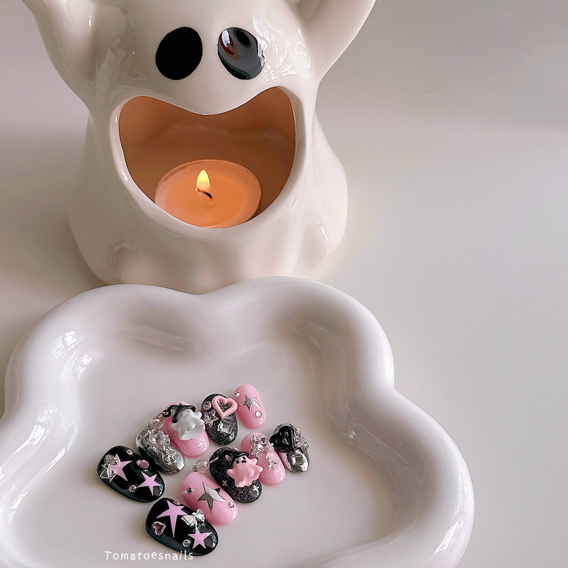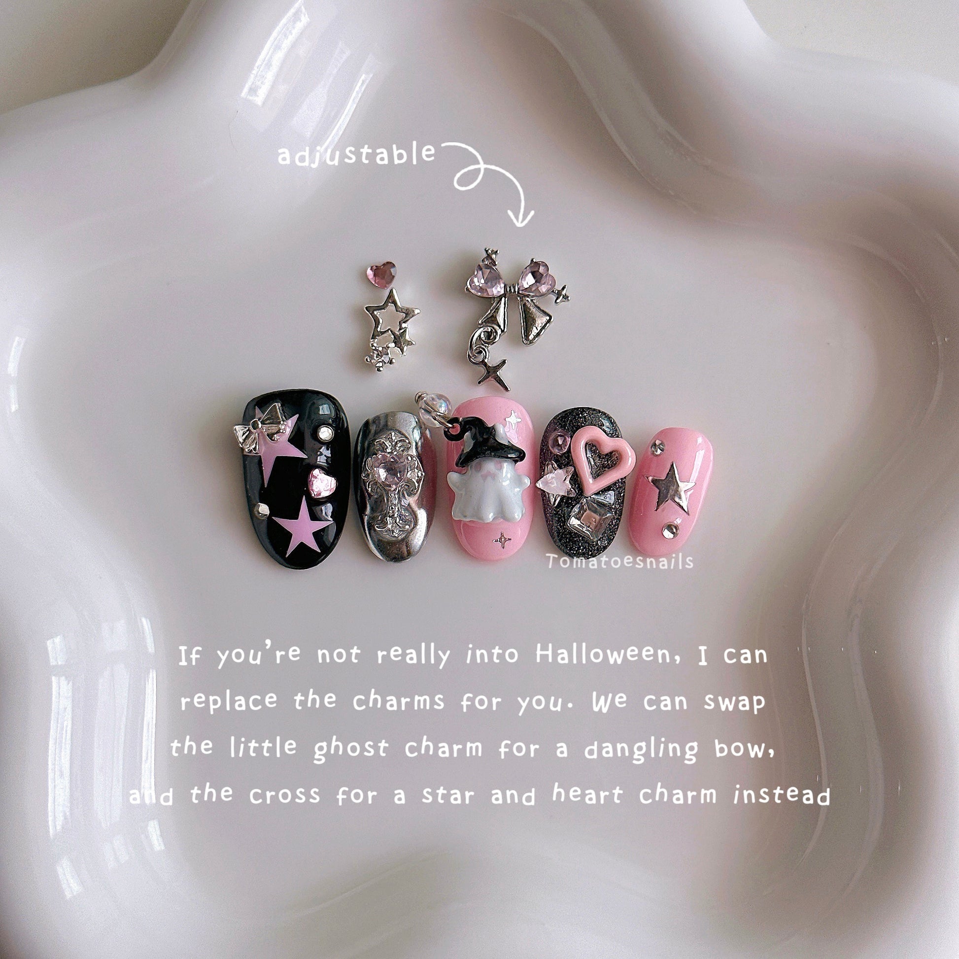 The little ghost has dangling charms. You can let me know if you'd like them sealed onto the nails so the charm doesn't move or get caught on things. If you're not really into Halloween, I can replace the charms for you.